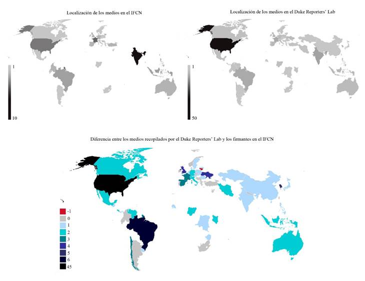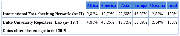 Tanto los medios de comunicación como las iniciativas de periodistas independientes que se dedi can a la verificación han proliferado en los cinco continentes, bien en países con sistemas demo cráticos estables o bien en aquellos que restringen derechos y libertades fundamentales tal y como se observa a partir de las bases de datos de medios que manejan las dos principales entidades: el Instituto Poynter a través del International Fact-checking Network (IFCN) y el Duke Reporters’ Lab. La tabla 1 muestra las diferencias existentes entre ambos listados. En primer lugar, destaca la diferencia numérica en la consideración de los medios de verificación (71 frente a 187) y, en se gundo lugar, si bien Europa, América y Asia ocupan las primeras posiciones, la comparativa entre listados evidencia una gran diferencia en la representación continental.
