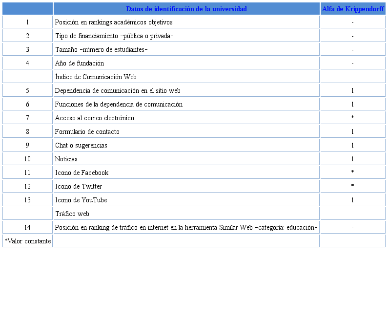 La ficha de análisis, que corresponde al libro de códigos, fue completada por dos codificadores, entre abril y junio de 2019, durante una agenda simultánea. Se analizaron 60 sitios web que corres ponden a las 60 universidades acreditadas en Ecuador. Al codificador que colaboró se le consignó aleatoriamente una muestra de 12 portales, que representan el 20%, con el propósito de calcular la prueba de fiabilidad intercodificadores, mediante el alfa de Krippendorff. El valor promedio debe ser αk ≥ 0,70 (Krippendorff, 2011). Se obtuvo αk = 1 (Tabla 1). Cabe mencionar que esto posible mente se debe a que no hubo mayor confusión durante el entrenamiento al colaborador -para lo cual se analizaron cinco portales universitarios de países diferentes- y tampoco hubo dudas durante la recopilación final de los datos.