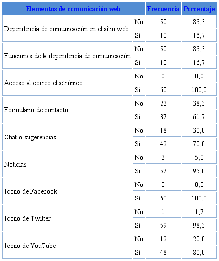 La home page de un portal web es la página más visitada (Piñeiro-Naval, Igartua & Marañón, 2017). Por lo tanto, el contenido que buscan los usuarios debe ser accesible desde allí. Las mejores universidades del mundo no aprovechan las ventajas que presenta internet para generar comunica ciones que incluyan diálogos abiertos con los usuarios (McAllister, 2012). El correo electrónico, el chat y el formulario de contacto son tres canales de comunicación interactiva, que forman parte de los sitios web analizados en este artículo. El primero está incluido en todos los portales universita rios de Ecuador. Esto pone de manifiesto la importancia que se otorga a la comunicación interna. En el caso de la comunicación con públicos externos, se evidencia también una preocupación por mantener diálogos con las audiencias, ya que, si bien no todos, la mayoría de portales ponen a disposición un chat y un formulario de contacto. Además, incluyen iconos que enlazan a las cuentas oficiales de las universidades en Facebook, Twitter e Instagram. Estos medios sociales son también canales de comunicación interactiva. No son los únicos que utilizan las instituciones de educación superior, pero sí son los más adoptados.