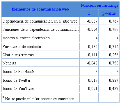 Con el propósito de cuantificar el grado de adopción de canales interactivos de comunicación y con el propósito de analizar estadísticamente su asociación con otros factores, se creó, como bien recomiendan Saraite-Sariene, Gálvez Rodríguez & Haro de Rosario (2018), un indicador. En este caso, el Índice de Comunicación Web. Se confirmó que no existe asociación entre el ICW y la posición en rankings aca démicos. Esto demuestra que la forma en la que se presentan o difunden los contenidos científicos sigue determinando los resultados en los rankings objetivos (Aguillo, Ortega, Prieto & Granadino, 2007).