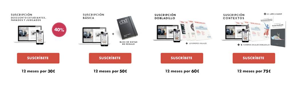 La revista está presente en redes sociales como Twitter, Facebook, Instagram, Youtube y Telegram, donde acumulan miles de seguidores y presentan una actividad intensa. El contenido de Ctxt es totalmente gratuito y abierto a los usuarios bajo la creencia de que el periodismo tiene que ser un servicio público. Sin embargo, el medio ofrece la opción de suscribirse y obtener algunas ventajas mediante cuatro tipos de suscripciones diferentes con descuentos para estudiantes, parados y jubi lados (ver gráfico 1). El precio oscila entre los 2,5 euros y los 6,25 euros al mes dependiendo de la opción elegida. Además, todas las suscripciones incluyen acceso a “El Saloncito”, que es la zona de suscriptores del medio, la carta semanal y adelantos editoriales. En 2017, Ctxt llegó a 5.000 sus criptores, que aportaban el 53% de los ingresos totales.