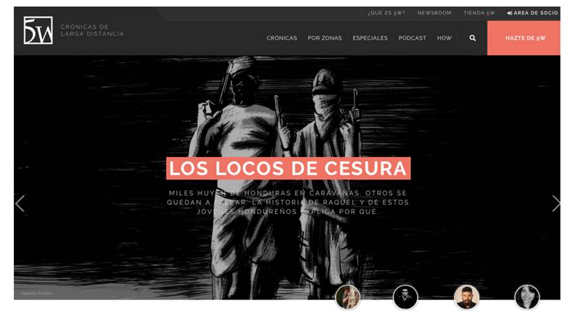 El proyecto 5W es una sociedad limitada sin un accionista mayoritario. Todos los fundadores tienen la misma participación en la empresa. La iniciativa cuenta con decenas de colaboradores distribui dos por el mundo. Se trata de una revista digital que, bajo uno de sus lemas “pequeñas historias, grandes explicaciones”, se preocupa por contar los sucesos internacionales y las historias concre tas de manera contextualizada y detallada. Se divide en cuatro secciones que reciben el nombre de: “Crónicas”, “Por zonas”, “Especiales” y “Podcast”. La primera sección contiene entrevistas, perfiles, reportajes, vídeos y ensayos fotográficos. La segunda se subdivide en cinco pestañas que corresponden a los continentes donde el usuario puede encontrar crónicas de cada uno de ellos. La tercera presenta reportajes inéditos y, por último, se encuentra el apartado de podcast que graban mensualmente los propios redactores del medio (gráfico 2).