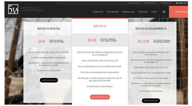 Su propuesta de valor, junto a la crónica internacional, se centra en contar historias de los lugares más remotos del planeta y de las personas que viven en ellos. El cibermedio parte del supuesto de que existen muchas historias lejos de nosotros que desconocemos y que merecen ser contadas, y que éstas no admiten un simple sí o un no, sino respuestas mucho más complejas que respondan a muchas preguntas que surgen después de leer una noticia o verla en televisión. Por ese motivo, el formato de los textos es extenso. Además, publican una revista anual en papel de tapa dura y hacen un programa de radio mensual. El contenido de 5W es gratuito, a pesar de que las crónicas sema nales permanecen cerradas cuando se publican y durante algunas semanas. Sólo pueden acceder a ellas los suscriptores (hasta que, posteriormente, las abren al público). De esta forma, los socios pueden ver la información en primicia, pero ésta acaba llegando a todo el mundo. El medio ofrece dos tipos de suscripciones que oscilan entre los 3 euros y los 5 euros. El usuario también tiene la opción de elegir su cuota personalizada y pagar lo que crea conveniente (aunque en todos los casos tiene ventajas, descuentos, recibe newsletters y en algunos casos también el libro Voces 5W, que se publica anualmente, y la revista anual en papel de tapa dura). En la actualidad, el proyecto posee alrededor de 2.900 suscriptores (gráfico 3).