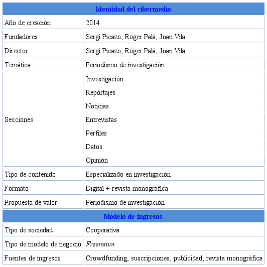 Su propuesta de valor se centra en apostar por el periodismo de investigación para combatir los “si lencios mediáticos”, priorizando el periodismo de datos y el fact checking. Además del sitio web, el cibermedio también edita anualmente una revista monográfica en papel llamada Dossier CRÍTIC. Los contenidos del proyecto son gratuitos, aunque algunos de ellos se publican inicialmente en cer rado durante uno o dos días para que los suscriptores puedan acceder de forma exclusiva. Es el caso del reportaje de investigación que el medio publica una vez por semana. Transcurrido este período, la información está en abierto al alcance de todos. El precio por suscripción oscila entre los 4,5 euros y los 5,3 euros al mes. Sin embargo, el medio ofrece la posibilidad de ampliar la cuota hasta 12,5 euros mensuales. Los suscriptores obtienen ventajas como la consulta en primicia de todos los reportajes y entrevistas, descuentos y promociones, descarga del contenido o boletín informativo, entre otros. El medio nació a partir de una campaña de micromecenazgo a través de la plataforma Verkami, con la que obtuvo más de 45.000 euros. Además, también contó con la aportación eco nómica (de entre 1.000 y 5.000 euros) de sesenta socios. Sus principales vías de financiación son la publicidad, los contenidos patrocinados (40%) y los suscriptores (40%). Otro 10% proviene de subvenciones o proyectos financiados por la Generalitat de Cataluña o por ayuntamientos. Su prin cipal reto es conseguir más suscriptores para finalmente depender solamente de ellos como fuente de ingreso.