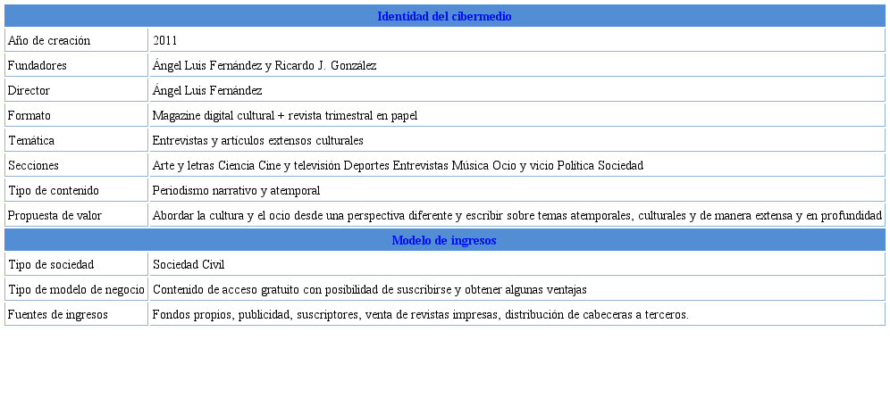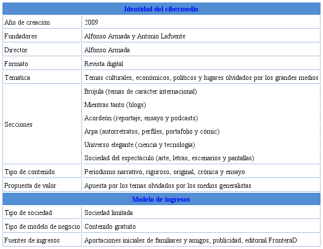 El proyecto FronteraD (www.fronterad.com) es una revista digital que habla sobre temas culturales, económicos y políticos, entre otros. Su equipo está formado por un director de arte, un director edi torial y un webmaster. Su principal hito es hacer buen periodismo siguiendo la escuela anglosajona con un periodismo riguroso, imaginativo y original, estimulando el espíritu crítico de los lectores. La revista forma parte de una sociedad limitada y nació en 2009. Inicialmente, el proyecto estaba concebido para ser una revista en papel, pero por falta de fondos se decidió que sería en soporte digital. Su gran referente era The New Yorker por su formato pausado y con reporteros dedicados a investigar las historias por mucho tiempo (ver tabla 12).