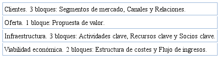 El modelo de negocio alude a la forma en que una organización estructura un sistema de funciona miento que busca alcanzar la sostenibilidad a partir de una serie de elementos clave para la conse cución de ingresos y beneficios (Demil y Lecocq, 2009). Se trata, por tanto, de una planificación estratégica dirigida a potenciar, desde un planteamiento más holístico, la comprensión, la creativi dad y reflexión sobre el proyecto desarrollado (Osterwalder y Pigneur, 2016). Destaca, en esta línea, el modelo Canvas que propone un esquema básico alrededor de la idea de negocio en cuatro áreas (clientes, oferta, infraestructuras y finanzas) y a partir de nueve elementos interrelacionados. Estos componentes siguen una secuencia lógica marcada por los siguientes indicadores: la propuesta de valor, las asociaciones estratégicas, las actividades clave, la relación con los clientes, el segmento de mercado, los recursos imprescindibles, los canales, la estructura de costos y las fuentes de ingre sos (ver tabla 1).