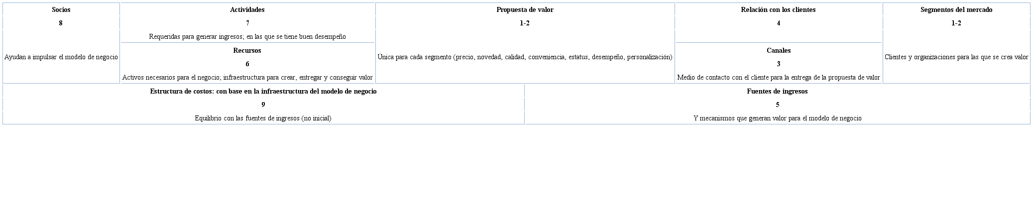 El modelo establece una serie de interrelaciones entre sus elementos (ver tabla 2). Por un lado, los apartados 1-5 aluden a elementos generadores de ingresos que sostienen el modelo de negocio; mientras que los apartados 6-9 indican la forma en que se realiza la oferta o propuesta de valor. La numeración contribuye además a establecer la secuencia de ejecución del esquema, siendo la propuesta de valor o los segmentos del mercado que queremos atender los puntos de inicio según la importancia que tengan uno u otro para el emprendedor. En este sentido, el modelo de negocio abarca a su vez el denominado modelo de ingresos, que constituye el objeto de estudio principal de la presente investigación.