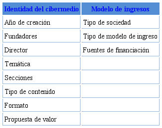La selección de este conjunto de proyectos ciberperiodísticos se ha realizado teniendo en cuenta una consulta a expertos, su naturaleza de medios nativos digitales, su apuesta por nichos de mer cado tematizados y su voluntad de ofrecer unos contenidos alternativos (tal y como apuntan en sus respectivos sitios web al presentar su proyecto) frente a los cibermedios consolidados del panorama mediático español. En todos los casos se trata además de medios nativos digitales creados en la úl tima década (entre 2009 y 2019). En cada caso, el análisis se realizó, en una primera fase, a través de una ficha (ver tabla 3) que abarcó tanto aspectos de la tipología del cibermedio como sus carac terísticas temáticas y, especialmente, las particularidades de su modelo de ingresos.