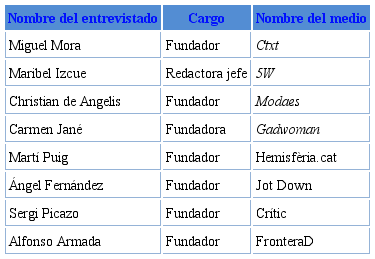 En una segunda etapa del estudio se procedió a entrevistar a los fundadores o principales respon sables de cada uno de los cibermedios seleccionados (ver tabla 4). Las entrevistas en profundidad, concebidas como una técnica estructurada de encuentros entre el investigador y los informantes (Rodríguez, Gil & García, 1996), buscaron la comprensión de las perspectivas que estos poseen res pecto a diversas temáticas, experiencias o situaciones (Taylor y Bodgan, 1994; Rincón, 1995). Las entrevistas, de carácter inédito, han permitido acceder y comparar los testimonios de los impulsores de los ocho proyectos de cibermedios nativos digitales seleccionados.
