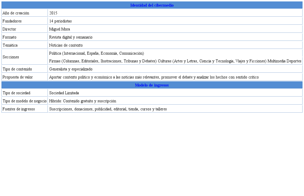 Ctxt (https://ctxt.es/), el primer cibermedio analizado, consiste en una revista que nace en 2015, cuando catorce periodistas procedentes de grandes diarios europeos advirtieron la necesidad de crear un medio que apostará por el análisis periodístico más allá de los contenidos marcados por los servicios de la última hora (ver tabla 5). Ctxt pertenece a Revista Contexto S.L., su empresa editora. Se trata de una revista digital que, bajo el lema “orgullosos de llegar tarde a las últimas noticias”, proporciona noticias contextualizadas sobre política, economía, temas de alcance internacional y comunicación. Asimismo, también cuenta con una sección llamada “especiales” donde el usuario puede encontrar entrevistas, reportajes, perfiles y otras piezas de distintas temáticas. Su propuesta de valor consiste en aportar contexto político y económico a las noticias más relevantes, promover el debate y analizar los hechos con sentido crítico y honestidad. Su formato es equilibrado y ana lítico, con un texto largo, bien escrito y con información cuidadosamente verificada. Aparte de la revista digital, Ctxt comercializa también un semanario en papel llamado El Dobladillo.