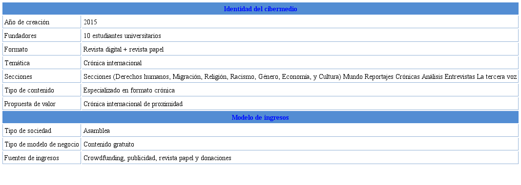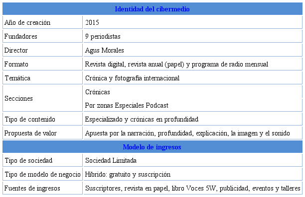El estudio de caso del cibermedio 5W (www.revista5w.com) permite identificar el proyecto como una revista digital de crónica de larga distancia que confiere un gran protagonismo al componente fotográfico. Fue fundada en 2015 por un grupo de nueve periodistas procedentes de distintos medios de comunicación que apostaron por un periodismo de contexto. Su nombre se inspira en las conoci das como cinco “W” (Who, What, When, Where, Why) del periodismo. El proyecto defiende que los sucesos internacionales no pueden contarse con tan sólo 140 caracteres ni tampoco en una página, sino que requieren una explicación mucho más extensa. Además de la revista digital, el proyecto edita una revista anual en papel y emite un programa de radio mensual (ver tabla 6).