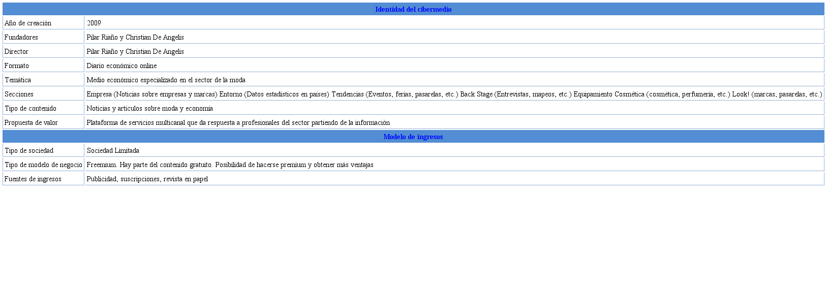 El cibermedio Modaes (www.Modaes.es) es un diario digital especializado en noticias económicas sobre la moda que nació en 2009 (ver tabla 7). La iniciativa surgió en el momento en que sus dos fundadores detectaron el nicho sin cubrir y las posibilidades que ofrecía crear un portal de noticias alrededor de la moda, pues los medios tradicionales no prestaban suficiente atención a la informa ción económica de este sector de gran peso en la economía española.