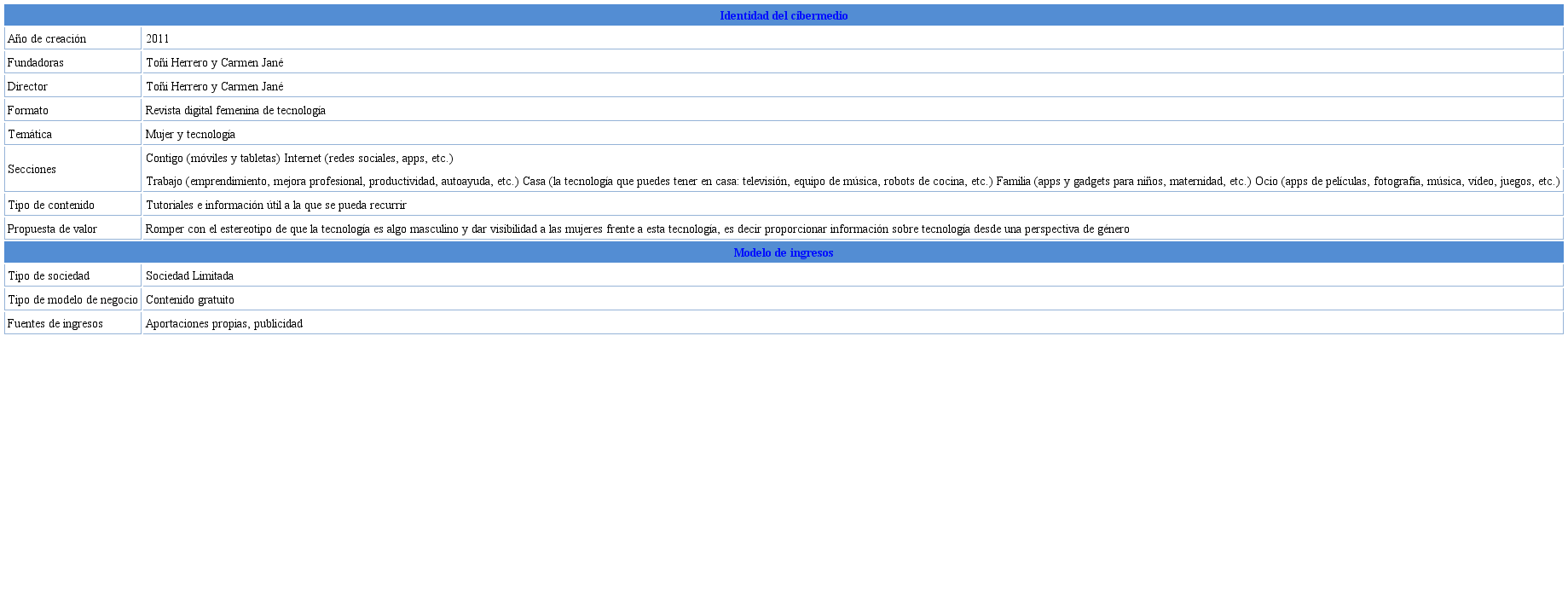 El cibermedio Gadwoman (https://Gadwoman.com) es una revista digital de información sobre tecnología desde una perspectiva de género. El proyecto nace en 2011 cuando sus dos fundadoras consideran que las páginas tecnológicas no explicaban para qué servían las cosas. Por otra parte, quisieron romper con el estereotipo de que las mujeres no están interesadas en los aspectos tecnoló gicos y que la tecnología es algo masculino (ver tabla 8).