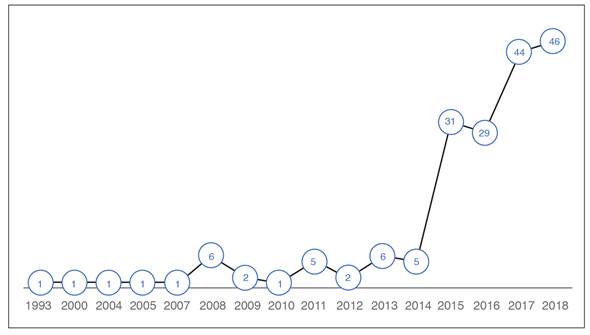 En relación con nuestra primera pregunta de investigación encontramos que siguiendo la ten dencia mundial, el número de publicaciones se incrementa de manera significativa cuando WoS incorpora nuevas revistas en la base de datos ESCI. La presencia de investigaciones colombianas en Web of Science comienza en el año 1993 con un artículo de Jesús Martín Barbero titulado “Latin-america-cultures in the communication media”, publicado en la Jour nal of Communication. Desde ese primer documento hasta el año 2008 sólo se publican cuatro trabajos (Figura 1). Hasta el año 2008 la presencia de trabajos de autores vinculados a la aca demia colombiana es mínima, posteriormente y hasta 2015 se muestra cómo todos los años se indexan varios trabajos. De manera consistente se publican muy pocos artículos, con excepcio nes de los años 2008 (6), 2011 (5), 2013 (6) y 2014 (5). En los primeros 24 años del análisis observamos que se publica un promedio de 1,3 artículos por año.