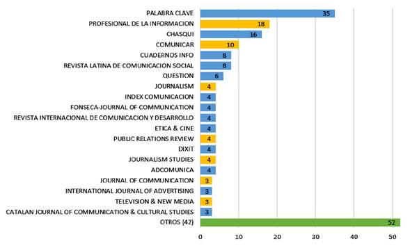 Seis revistas han liderado la publicación de conocimiento en comunicación de autores vinculados a la academia colombiana, tres de ellas son españolas: “El Profesional de la Información”, “Comuni car” y “Revista Latina de comunicación Social”. Una es chilena “Cuadernos.info” y la otra ecuato riana “Chasqui”. La única colombiana de este grupo que aglutina la mayor cantidad de artículos es “Palabra Clave”. Todas estas revistas fueron incorporadas en la ampliación de WoS del año 2008 o en la posterior creación de ESCI (2015).
