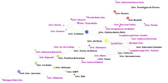 Se observan cuatro clústeres principales. El mayor es el encabezado por la Universidad del Norte (8 nodos) que aglutina a la Universidad del Externado y a la Universidad Iberoamericana junto con seis universidades extranjeras. En segundo lugar, nos encontraríamos un grupo poco cohesionado liderado por la Universidad de Medellín que cuenta con cuatro universidades colombianas y cuatro universidades extranjeras (2 españolas, 1 mexicana y una estadounidense). Le siguen dos grupos por tamaño, el liderado por la Universidad de La Sabana junto a 5 universidades internacionales y el de las Universidades de los Andes y la Pontificia Bolivariana, cuya esencia es principalmente colombiana. (Véase Figura 3)