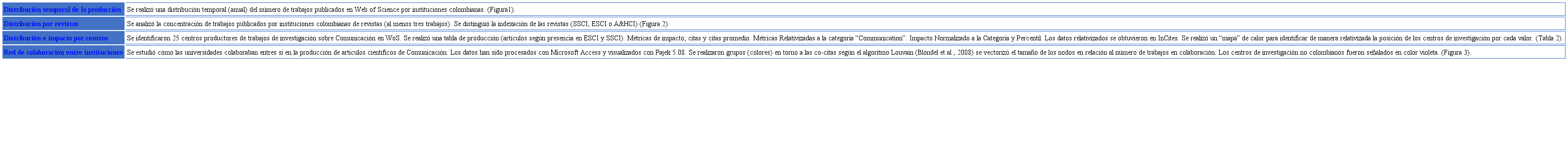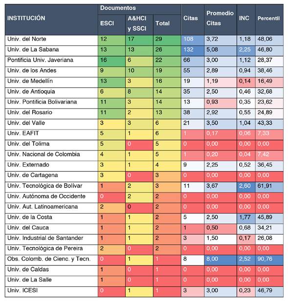 La distribución de artículos en Web of Science según instituciones colombianas (Tabla 2) nos mues tra cómo la mayor parte de las instituciones son universidades a excepción del “Observatorio Co lombiano de Ciencia y Tecnología”. Lo que reafirma que la producción intelectual recae en las universidades y no ya en los centros u observatorios independientes como ocurrió hace años, o como puede ser común en otras disciplinas. El 73% de los artículos de comunicación colombianos registrados en WoS son publicados por las 8 universidades más productivas, encabezadas por la Universidad del Norte y la Universidad de la Sabana con 29 y 22 trabajos respectivamente.