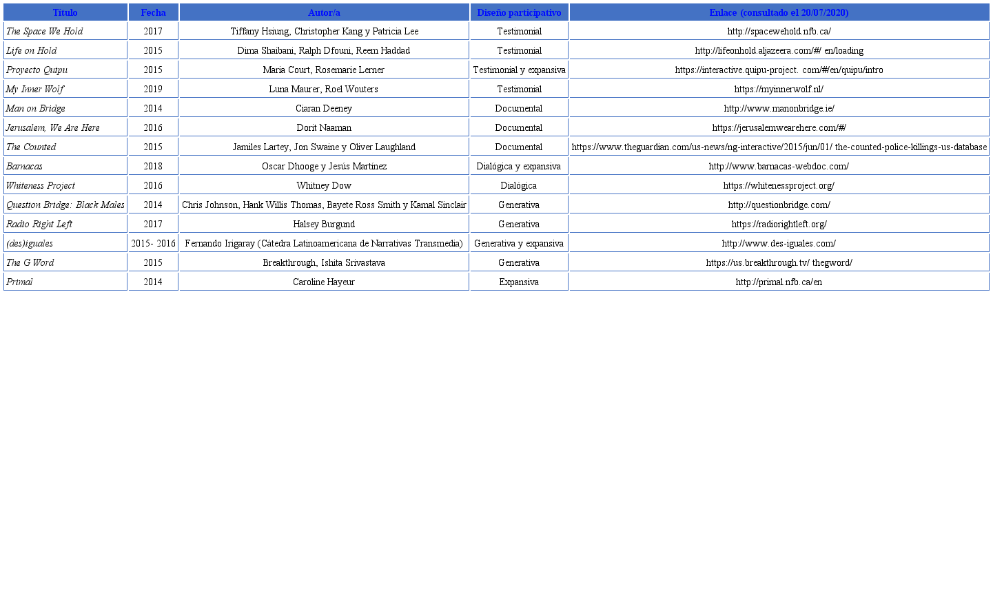 El proceso ha comenzado con una consulta en la Docubase del MIT Open Documentary Lab, que es uno de los principales directorios de producciones de no ficción interactiva. Para tener en cuen ta solo las iniciativas participativas, se ha realizado una búsqueda con los filtros “participatory”, “co-creation”, “community collaboration”, “community generation”, “collaborative storytelling” y “crowdsourcing”. Además, para que la investigación tenga una perspectiva reciente, se han incluido solo los proyectos iniciados en el periodo entre 2014 y 2019. La selección, teniendo en cuenta solo aquellos casos en los que la participación se refería a la comunidad online, ha sumado nueve producciones (Life on Hold; Proyecto Quipu; Man on Bridge; Jerusalem, We Are Here; The Counted; Question Bridge: Black Males; Radio Right Left; The G Word: Transforming gender norms, one story at a time; y Primal). La muestra se ha completado después con una búsqueda en el listado de proyectos destacados por el Co-Creation Studio del MIT Open Documentary Lab (The Whiteness Project, (des)iguales), en InterDOC (Barnacas), en festivales de relevancia como IDFA (My Inner Wolf) y en el catálogo de un productor de referencia como es el National Film Board of Canada (The Space We Hold).