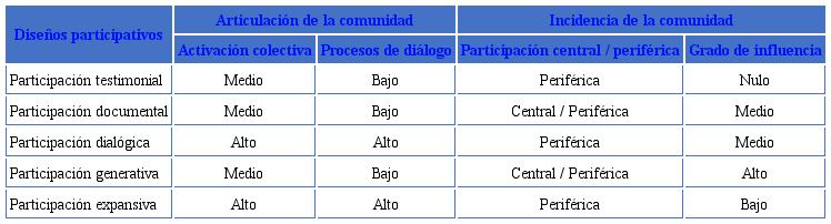 Con esa finalidad, la presente investigación aporta una categorización original de algunos de los diseños participativos que tienen lugar en los i-docs colaborativos, lo que podrá ser empleado para definir y evaluar el papel de la comunidad conectada en este tipo de producción. No se trata de incluir todas las posibles formas que puede adoptar la participación en este tipo de producción, sino de describir una serie de tendencias que se han detectado en diversos casos. Hay que señalar además que estos diseños no son excluyentes, sino que pueden convivir en una misma iniciativa. Las categorías que proponemos son (Tabla 1):