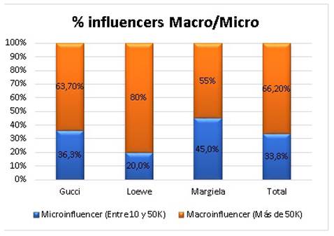 La gráfica 1 muestra que, en todos los casos, el porcentaje de macroinfluencers (56,20%) supera a los microinfluencers (33,8%). El máximo índice lo alcanza la firma Loewe (80%), seguida por Mar giela (55%) y por Gucci (53,70%). Estos datos revelan también que el factor de influencia no viene determinado sólo por el número de seguidores, sino que reside en el modelo de estrategias de co municación y marketing para acceder a los públicos, generar difusión, convertir en trending topic el mensaje y convencerles para su compra, como eslabón final de la cadena productiva (Khan, 2018).