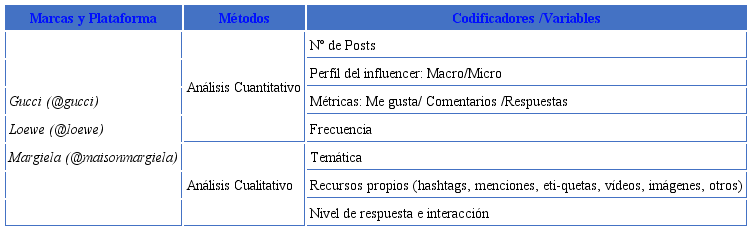 A partir del seguimiento de las cuentas digitales de tres marcas internacionales de moda y lujo como Gucci ("gucci), Loewe ("loewe) y Margiela ("maisonmargiela), pertenecientes a tres holdings de referencia como Kering, LVMH y OTB se analiza, por una parte, la función de los influencers, la temática de sus posts y el grado de acción e interacción con los usuarios y las marcas. Estos in dicadores de contexto se vinculan con el objetivo O1 y O2 en tanto que proporcionan información acerca del tipo de estrategias proyectadas por las marcas de moda así como su conexión con los influencers y usuarios.
