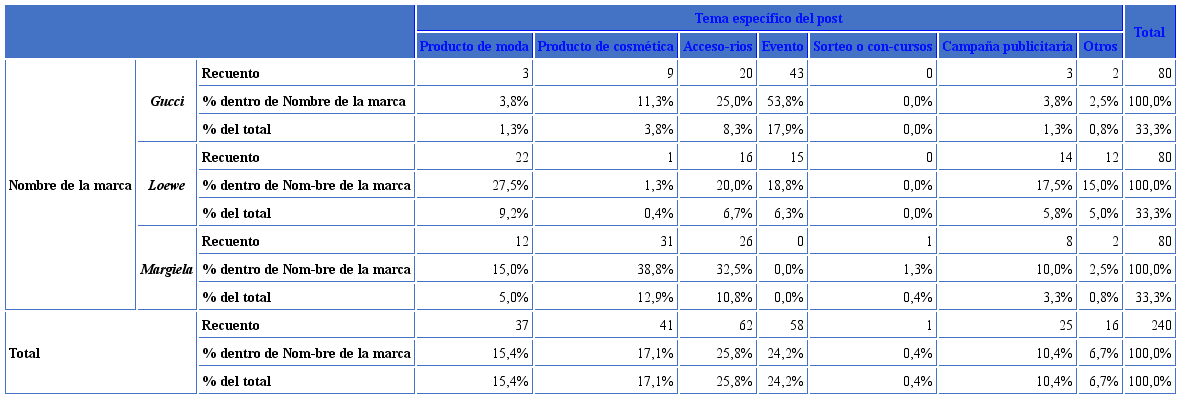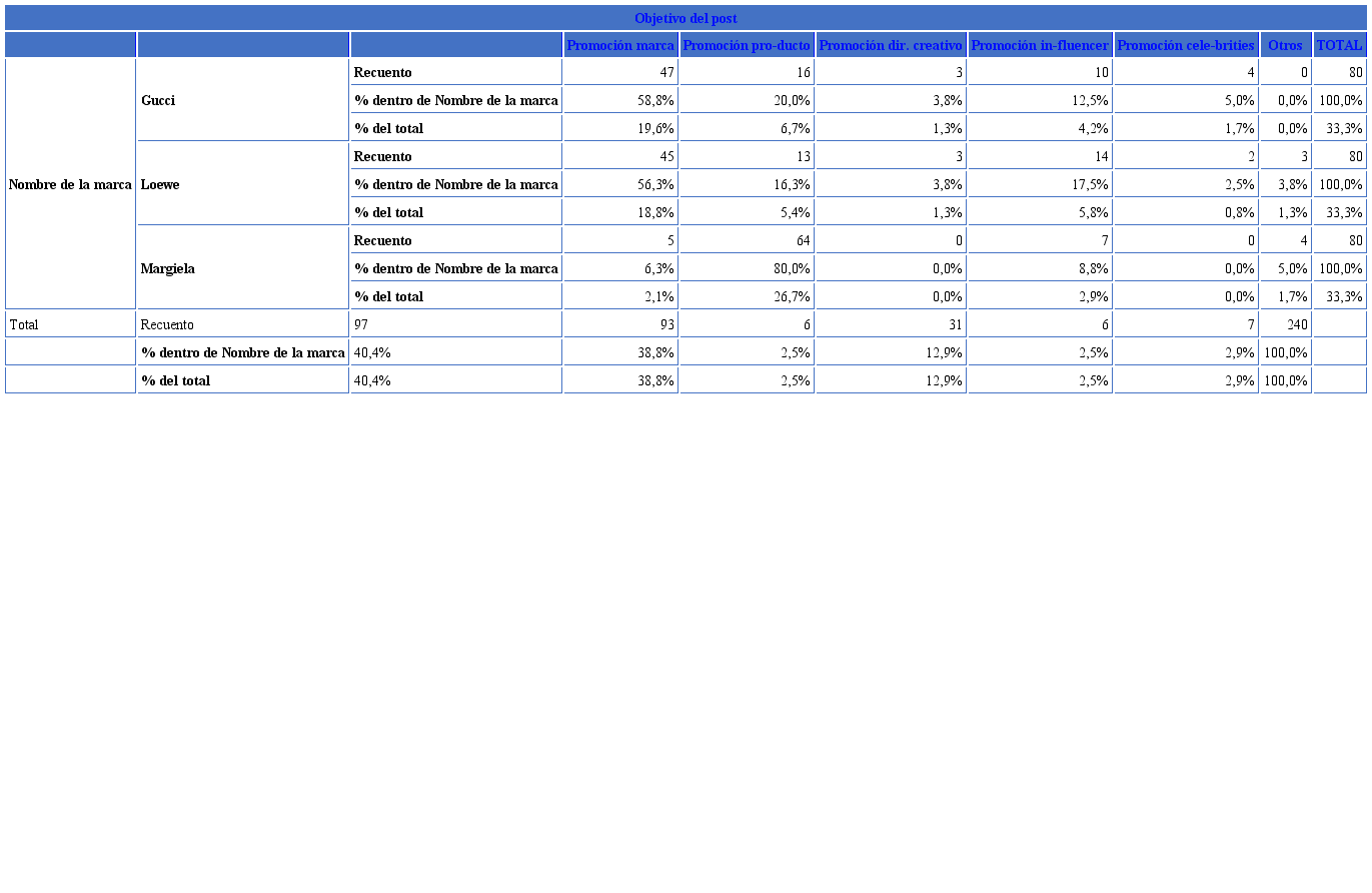 De este modo, si bien no se trata de un estudio que implique la totalidad del universo de todas las marcas de moda y lujo operativas en el mercado, ofrece una perspectiva global del sector, primando el interés y análisis de los posts generales (3756) y específicos (240) publicados por las marcas.