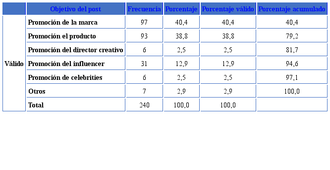 Cuantitativamente, los porcentajes globales de frecuencia (Tabla 4) relativos a las tres empresas de moda, confirman también la teoría de la revalorización de marca (40,4%) y producto (38,8%) frente a un porcentaje de presencia inferior del influencer (12,9%). La promoción del directos creativo de la marca y de las celebrities (2,5%) no alcanzan porcentajes referentes y muestran cómo el foco dominante se sitúa en la promoción de marca y producto.