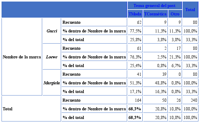 Gucci se sitúa como marca con mayor número de posts referidos a moda (77,5%) frente a Loewe (76,3%) y Margiela, con un porcentaje inferior (51,3%). Sin embargo, es esta marca la que alcanza en el área de cosmética un porcentaje muy superior (48,8%) frente al conseguido por Gucci (11,3%) o Loewe (2,5%). Los productos de cosmética se han convertido en alternativa principal de ventas para algunas empresas, dado que son más asequibles para un público más amplio y diverso, propio de las redes sociales. En cualquier caso, la moda sigue ocupando el primer puesto con respecto al resto de temáticas.