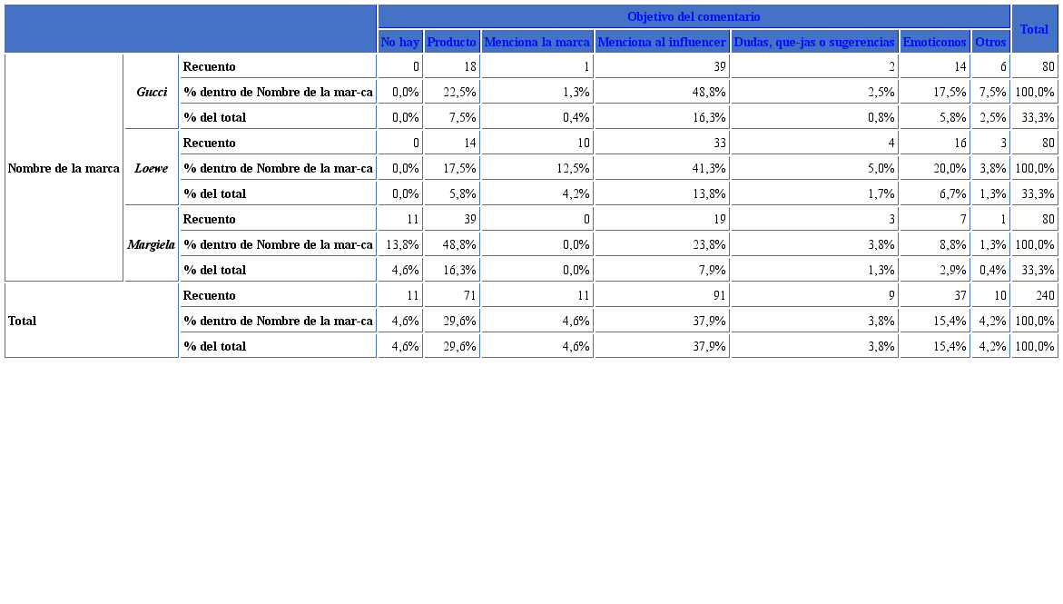 Destacamos los resultados (Tabla 7) que revelan cómo la mayoría de los comentarios de los usuarios mencionan en primer lugar al influencer (37,9%) seguido del producto (29,6%) y del uso de emotico nos (15,4%), quedando la marca relegada a un cuarto lugar (4,6%). Los seguidores de las cuentas de las tres marcas en Instagram continúan manifestando un interés primario hacia esta figura y comentan sobre su vida personal, su imagen o sobre las stories que los líderes suben a la red. Sin embargo, los datos confirman que el producto sigue siendo un factor relevante en los comentarios, aunque habría que comprobar si se trata del producto que difunde la marca o de otro producto vinculado al influencer.