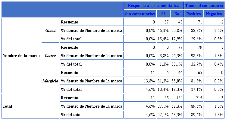 De manera individual destaca Loewe con un nivel de no-respuesta (96,3%), seguida por Margie la (55,0%) y Gucci (53,8%). Salvo en el caso de Loewe, con un bajo nivel de respuesta, el resto de marcas muestra cierto equilibrio. Independientemente del elevado porcentaje de no-respuesta compartido por las tres marcas, destaca el tono positivo de comentario de los usuarios, denotando el interés y en algunos casos, la pasión de los instagramers, como fans (advocates) de la marca y, especialmente, de los influencers.