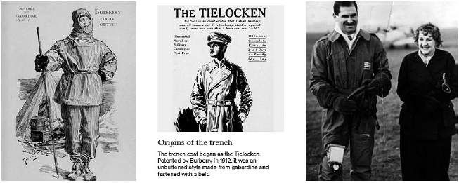 A continuación, se muestra la creación del Trenchcoat especialmente confeccionado para satisfacer las necesidades de los militares a principios del siglo XX. Los epaulettes mostraban el rango de un oficial, mientras que los anillos en D metálicos del cinturón se utilizaron para cargar equipos y armas.