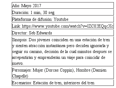 Parte central unida al gancho: El protagonista masculino decide volver por la protagonista femenina, intenta alcanzarla subiendo al tren que ella abordó pero su búsqueda se vuelve turbulenta y larga.
