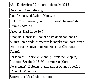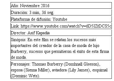 Este análisis será aplicado a 3 fashion films. Timeless Elegance de la marca Lacoste, The tail of Thomas Burberry de la marca Burberry y Reincarnation de la marca Chanel.