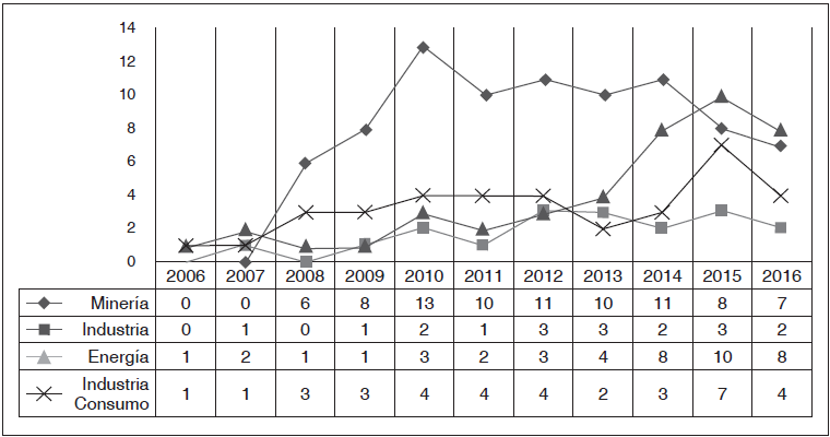 El mayor número de publicaciones corresponde a las empresas mineras, industriales y de energía. Esto obedece a que la actividad productiva de las empresas mineras tiene una fuerte influencia e impacto en las comunidades campesinas y en el medioambiente donde se desarrollan estas colectividades. Por ello, se presenta una necesidad de rendir cuenta sobre una actividad responsable, frente al Estado, la sociedad y las organizaciones civiles como una búsqueda de legitimidad social de sus actividades (Gifford y Kestler, 2008; Slack, 2012; Jaskoski, 2014).
