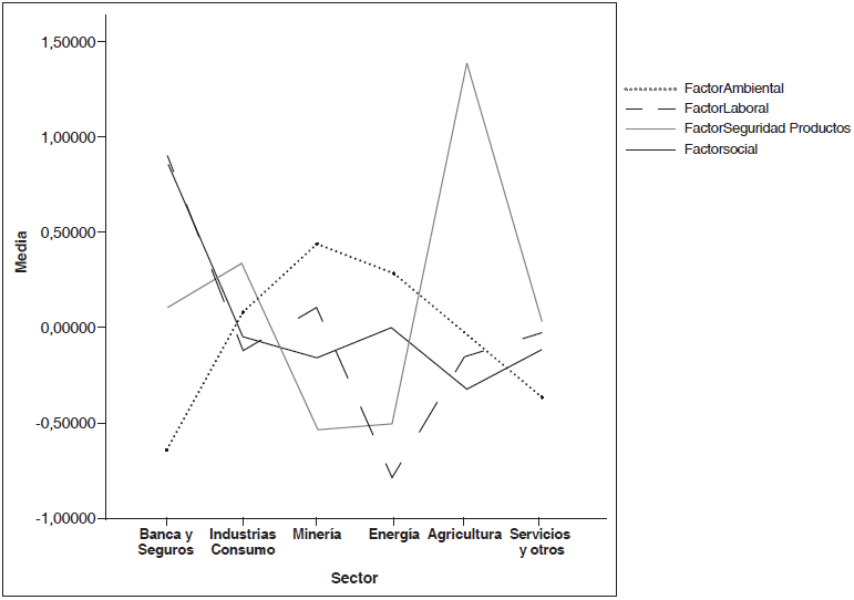 El primer componente denominado “factor ambiental” representa las prácticas según los indicadores ambientales relacionados con la gestión de agua, residuos, emisiones, energía. Es característico y con mayor incidencia en las empresas mineras, así como en las industriales y de energía, ya que, por su naturaleza, utilizan recursos naturales y rinden cuenta de ello. Además, el segundo componente de “factor laboral” de prácticas con los colaboradores, es ampliamente informado por las empresas financieras y de seguros. Las mineras y de servicios (constructoras y telefonía), además de su desempeño ambiental, realizan importantes prácticas de desempeño con sus colaboradores. El tercer componente de “factor de seguridad de productos” representa las prácticas según los indicadores de responsabilidad de productos con los clientes como las prácticas informadas de seguridad e información de productos de consumo o exportación de empresas industriales y agrícolas. Por último, el cuarto componente de “desempeño social” con la comunidad es aplicado en gran medida por todas las empresas, pero destaca el sector financiero, sobre todo, aquellas adscritas al Pacto Mundial de la ONU.