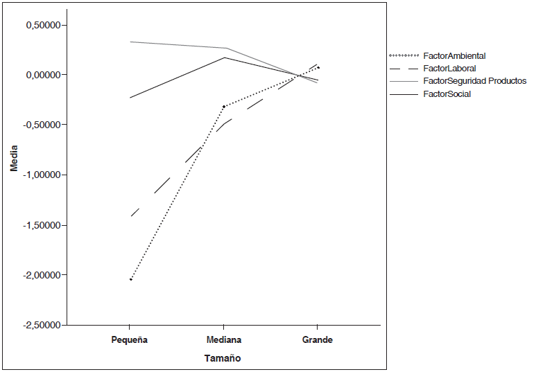 La Tabla 1 muestra que el tamaño incide significativamente (sig. < 0.05) solo en el nivel de información de desempeño laboral. Es decir, las empresas con mayor número de colaboradores presentan un mayor nivel de cumplimiento de información sobre desempeño laboral. Para el resto de componentes, el tamaño no incide significativamente en el nivel de cumplimiento de información de sostenibilidad.