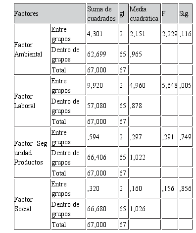 La prueba de análisis de varianza (ANOVA), encuentra que la media del nivel de información de sostenibilidad no difiere significativamente en todos sus aspectos de acuerdo al tamaño de las empresas estudiadas, solo el factor de nivel de información laboral varía significativamente con el tamaño de las empresas. Es así que la H1, se rechaza solo para el caso de la información de desempeño laboral, que se ve influenciada por el tamaño de las empresas según el número de trabajadores.