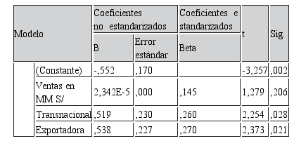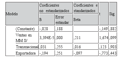 b. Predictores: (Constante), Exportadora, Ventas en MM S/, Transnacional