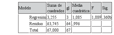 Elaboración propiaTambién, se realizó una regresión lineal para evaluar si el tamaño (ventas), la naturaleza transnacional y la naturaleza exportadora (como variables independientes) influyen significativamente en el nivel de información social. Para validar el modelo, se verificó un contraste de regresión de Sig. 0.360 no menor a 0.05 como muestra la Tabla 4. Estos indicadores señalan que las variables independientes no influyen de manera significativa en dicha variable de información ambiental.