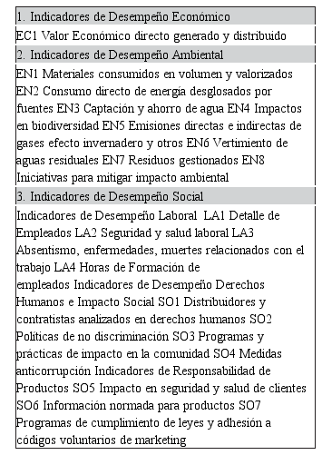 Indicadores de la GRI consideradas como variables de cumplimiento de desempeño de sostenibilidad