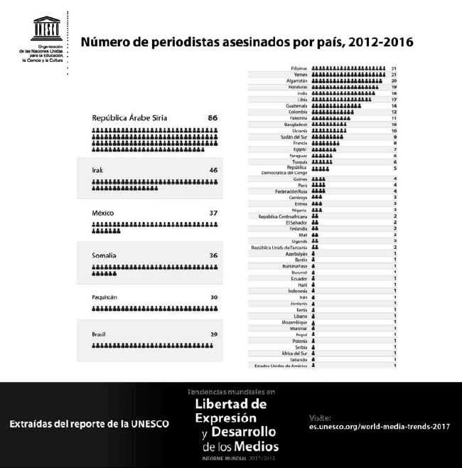 La edición 2017 de la Clasificación Mundial de Libertad de Prensa de Reporteros sin Fronteras incluyó a 180 países, de los cuales México y Cuba presentaron las peores condiciones para los periodistas de Latinoamérica (en los lugares 147 y 173 de la lista, respectivamente). Según este reporte, los países nórdicos no poseen riesgo alguno para practicar el periodismo; Estados Unidos, Canadá y Australia son considerados un buen lugar, sin embargo, México es posicionado en el nivel denominado “situación difícil”, siendo uno de los países con menor libertad de expresión en América Latina. El Committee to Protect Journalists (CPJ 2017a) clasifica a los asesinos de periodistas a nivel mundial en seis categorías: gobiernos, militares, paramilitares, grupos políticos, muchedumbres y residentes locales.