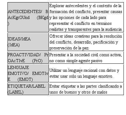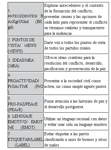 Con base en las propuestas del Peace Journalism (Galtung, 2002; Lynch, 2015) y la experiencia de la autora en la aplicación de este modelo para analizar conflictos (Nicolas-Gavilan, 2012, y 2015), se proponen siete características –que se pueden considerar categorías de análisis de contenido– para determinar si una noticia tiene un enfoque de Peace Journalism . War Journalism. (1) La noticia debe mostrar los antecedentes y el contexto de la formación del conflicto. (2) La nota debe presentar diversas opiniones de cada bando enfrentado o afectado, en otras palabras, debe darle voz a todos los puntos de vista de todos los partidos rivales. (3) Ofrecer ideas creativas para la resolución del conflicto, dando cierto protagonismo a los actores que proponen soluciones. (4) La información debe presentar a la sociedad civil como activa, no como simple agente pasivo que sufre las consecuencias de los enfrentamientos. (5) Las noticias tienen que favorecer la aparición de las propuestas de paz de los distintos actores y señalar los puntos positivos, dando seguimiento a la etapa de postconflicto. Estos cinco aspectos corresponden al contenido y fondo de la noticia, pero también es importante atender a la forma, es decir al cómo se redactan las noticias, en ese sentido proponemos analizar (6) el lenguaje para determinar si es racional o emotivo, es decir que no aporta datos sino emociones. (7) Por último analizar si es un lenguaje neutro o culpabilizado, es decir que califica a los actores como buenos y malos.