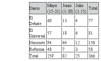 También permiten comprobar el ciclo de la noticia, la cual inicia con mucha fuerza informativa ya que los primeros quince días se publican el 70.7% de todas las 366 noticias, después decae notablemente la publicación de notas en todos los periódicos, a tal grado que los últimos quince días se publican solo el 10% del total.
