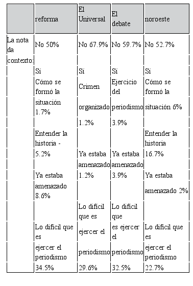 No obstante, el dato anterior, resulta muy interesante el comprobar que, en todos los periódicos, tanto nacionales como locales, al dar un contexto, se refieren –en un alto porcentaje– a lo difícil que es ejercer el periodismo en México. El dato anterior muestra que los profesionales de la información son conscientes de los peligros que experimentan y quieren hacerlo ver al público. Como se dijo antes, este país es el tercero más peligroso para ejercer el periodismo en el mundo y así debe ser percibido.