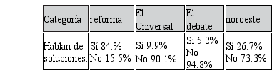 En cuanto a la segunda categoría, que hace referencia a las soluciones que presentan los medios (IDEAS) se observa que tres periódicos no presentan soluciones relativas a esclarecer la verdad en torno al asesinato del periodista y al proceso judicial (Tabla 3). Este enfoque es claramente orientado al war journalism. Los resultados no sorprenden porque en México la impunidad ante los crímenes y la corrupción -según el Barómetro Global de la Corrupción el país del sol azteca encabeza la lista en América Latinason dos lacras que dificultan la vida democrática y el estado de Derecho.
