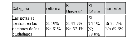 La tercera categoría analizada es la proactividad de la sociedad civil (PROP) y para determinarla se estableció como indicador el hecho de que las noticias se centraran en protestas o marchas en las que participara la sociedad civil. Para determinar su porcentaje se comparó contra el total de las notas publicadas por cada periódico. Lo primero que llama la atención es la gran diferencia que existe en la cobertura de las marchas en los dos periódicos locales: El Debate centra sus notas en las marchas en un 70%, en un sentido inverso proporcional Noroeste lo hace en un 30.7% (Tabla 4). En el caso de los diarios nacionales encontramos que El Universal es más proclive a cubrir estás notas, incluso más que el diario local El Debate