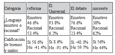 Por lo que se refiere a las siguientes categorías de análisis, estas se centran en la forma en cómo está escrita la nota, es decir el uso del lenguaje es emotivo o racional (EMOT) y la calificación o no de los actores del hecho en buenos y malos (LABEL). Los resultados obtenidos fueron muy interesantes. Es llamativo que ningún medio cumple con ambas características con un enfoque hacia el peace journalism, es decir que cuando un periódico utiliza un lenguaje más racional, lo propio del peace journalism, por contra sí califica a las partes en buenos y malos lo que indica que es un enfoque de war journalism como les ocurre al Noroeste. También ocurre lo contrario si no califica a las partes (peace journalism) en cambio sí se utiliza un lenguaje más emotivo (war journalism) como hacen El Debate . El Universal. El periódico más equilibrado es Reforma, con porcentajes más similares en ambas variables.
