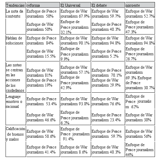 Los resultados consolidados de las cinco categorías de análisis nos muestran que en general la cobertura del asesinato de Javier Valdez fue con un enfoque hacia el war journalism. Solo en seis de las veinte categorías, correspondientes a los 4 diarios, se aprecia un predominio del enfoque peace journalism –en negrita–. El periódico Reforma tuvo un mayor enfoque al peace journalism.