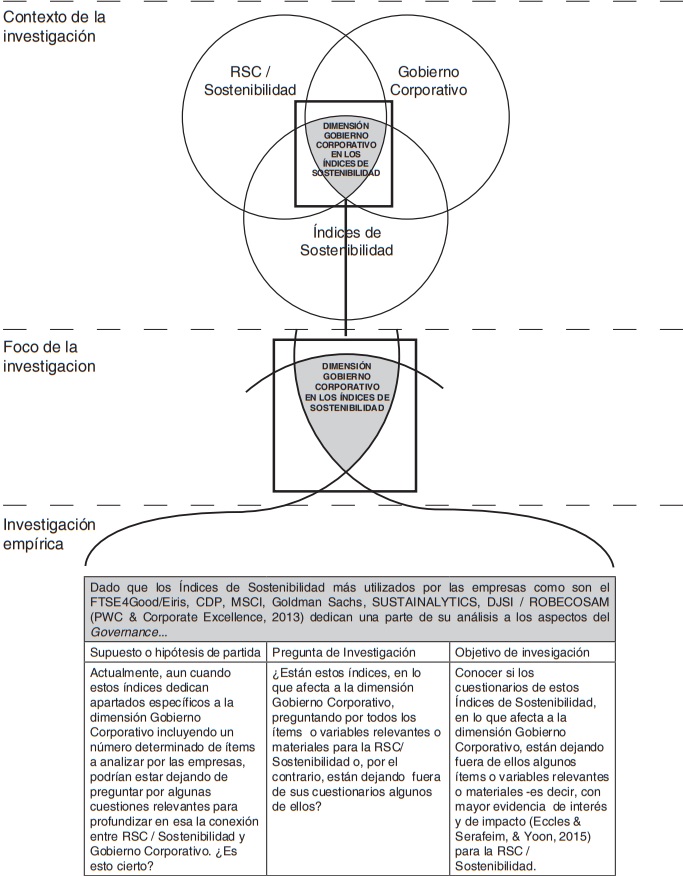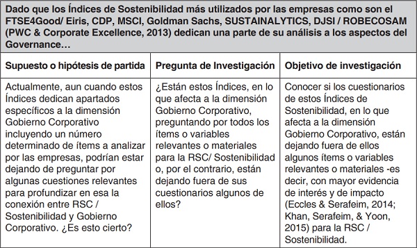 Por todo ello, y como consecuencia de todos estos hallazgos sobre la interrelación entre Gobierno Corporativo y Sostenibilidad, se abre una oportunidad de investigación. Desde un punto de vista práctico, en la medida en que todos los índices de sostenibilidad dedican una parte de su análisis al governance de las empresas y de que no existe un marco común ni en los objetivos, ni en la metodología, ni en el cuestionario, la oportunidad de la investigación radica en hacer una revisión crítica sobre el tratamiento que dan los índices a la forma en la que se gobierna una empresa, es decir, a su gobierno corporativo.