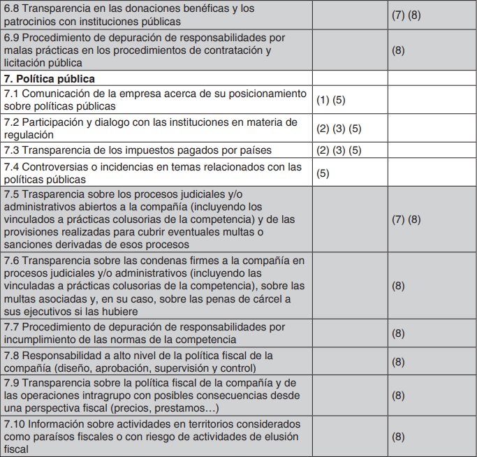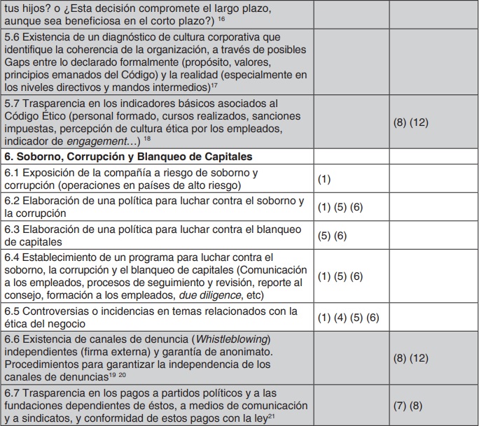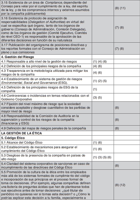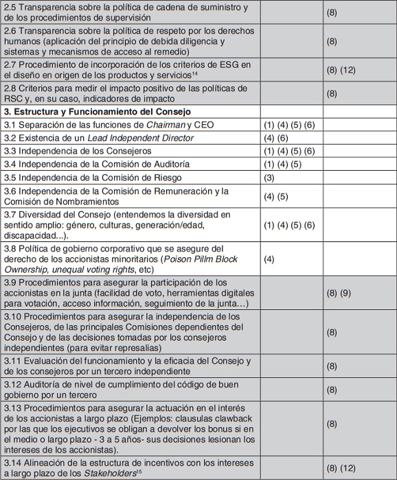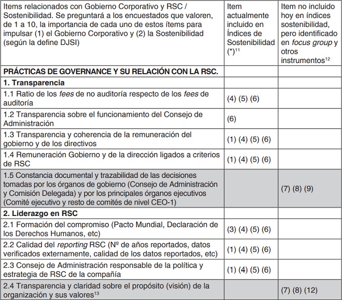 - Todas las cuestiones vinculadas a governance que actualmente se incluyen en índices de sostenibilidad más usados por las compañías, tomando como base el estudio realizado por PWC (Executive Workshop: Índice Sintético de Sostenibilidad, 2013), que ascienden a 33 ítems repartidos en dos bloques: prácticas del governance (estructura del consejo, liderazgo en RSC, transparencia y gestión de riesgos), y gestión de la ética (código ético, corrupción, y política pública).